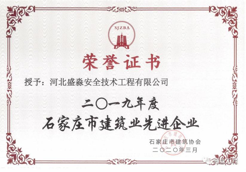 “石家莊市建筑業先進企業”榮譽證書