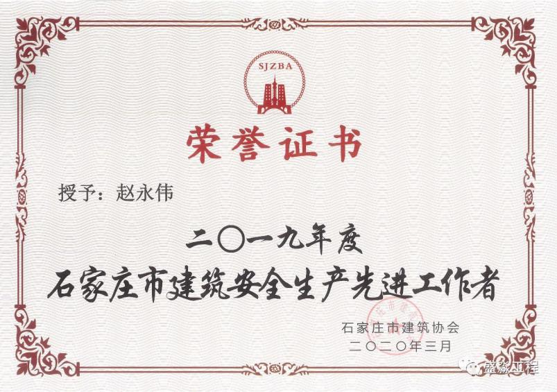 榮獲“石家莊市建筑安全生產先進工作者”榮譽稱號!